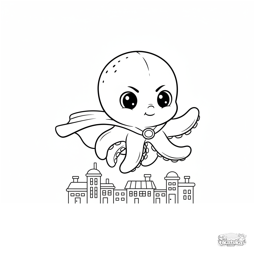 Página para colorear para niños: Pulpo Bublik con capa de superhéroe vuela sobre una ciudad de juguete. Pose dinámica, formas simples de edificios.