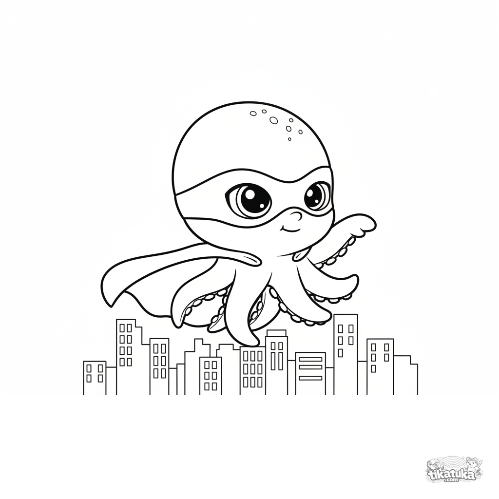 Página para colorear para niños 4-6: Pulpo Bublik con capa de superhéroe vuela sobre la ciudad. Pose dinámica, silueta simple del horizonte.