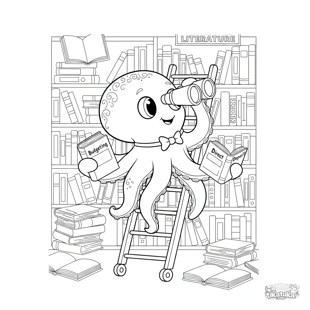 Página para colorear para niños 10-12: un pulpo inteligente en una biblioteca usa prismáticos y una escalera para buscar literatura financiera. Escena graciosa y detallada en estilo papel cortado.