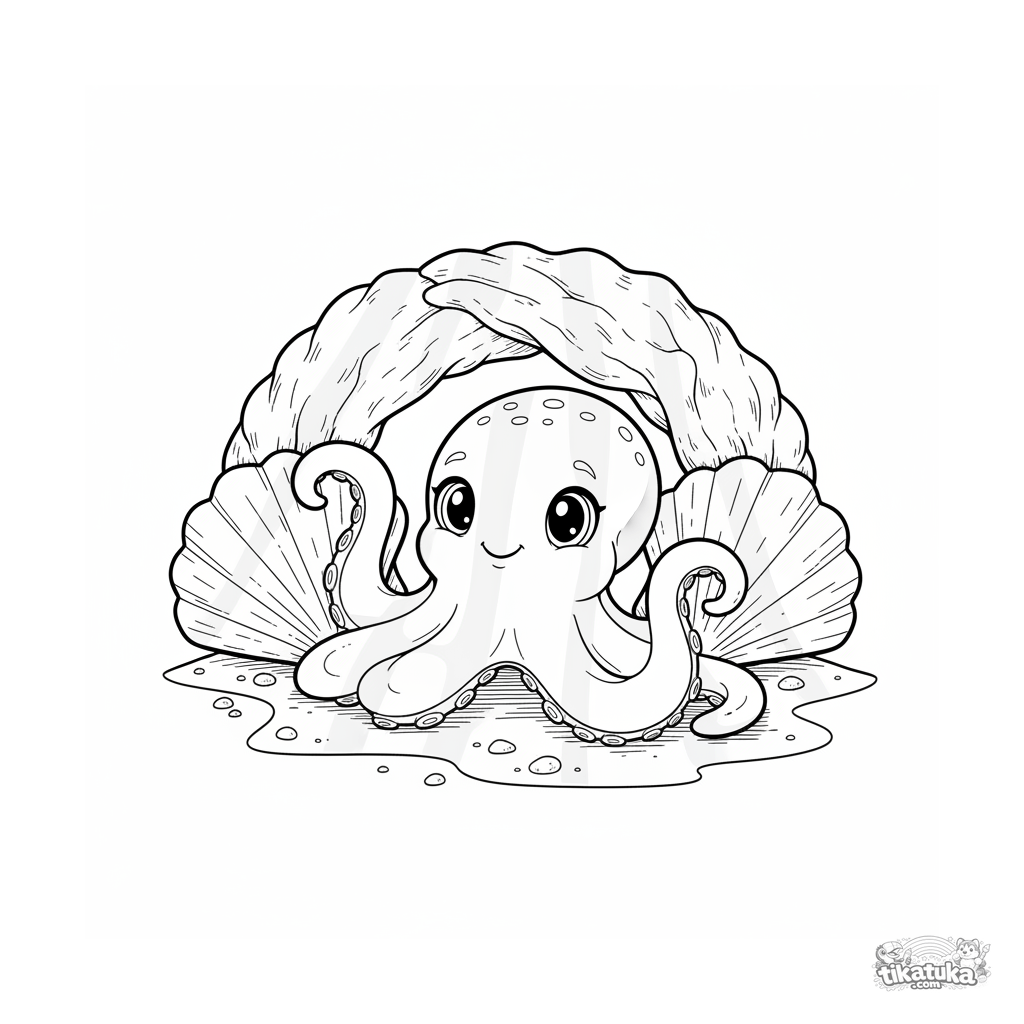 Página para colorear de un pulpo inteligente asomándose desde bajo un arco de conchas en aguas poco profundas iluminadas por el sol.