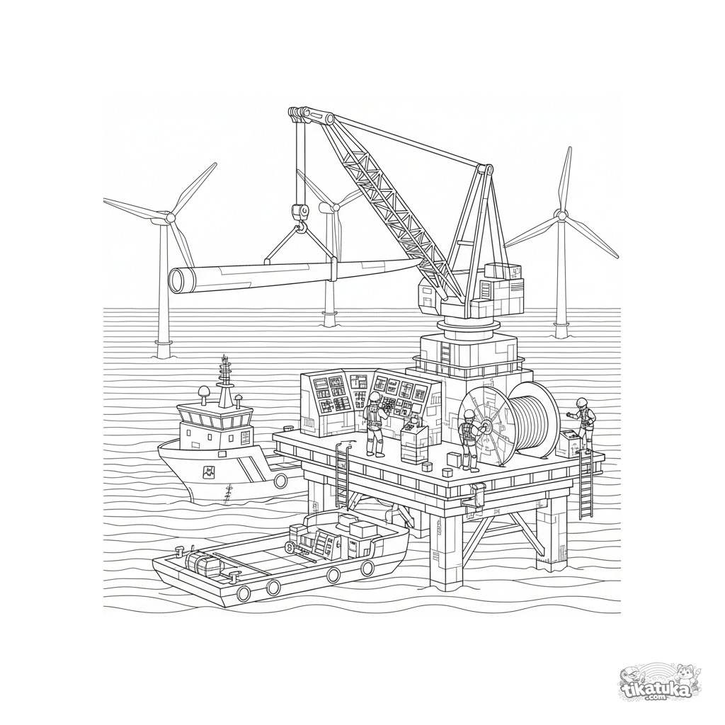 Página para colorear para 10-12 años: plataforma industrial de mantenimiento para parques eólicos marinos. Técnicos, equipos, grúa y barco de servicio. Escena técnica detallada en el mar.