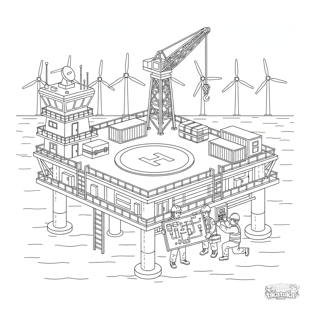 Página para colorear para 10-12 años: una detallada plataforma de mantenimiento para turbinas eólicas marinas, con helipuerto, grúa y técnicos con cascos.