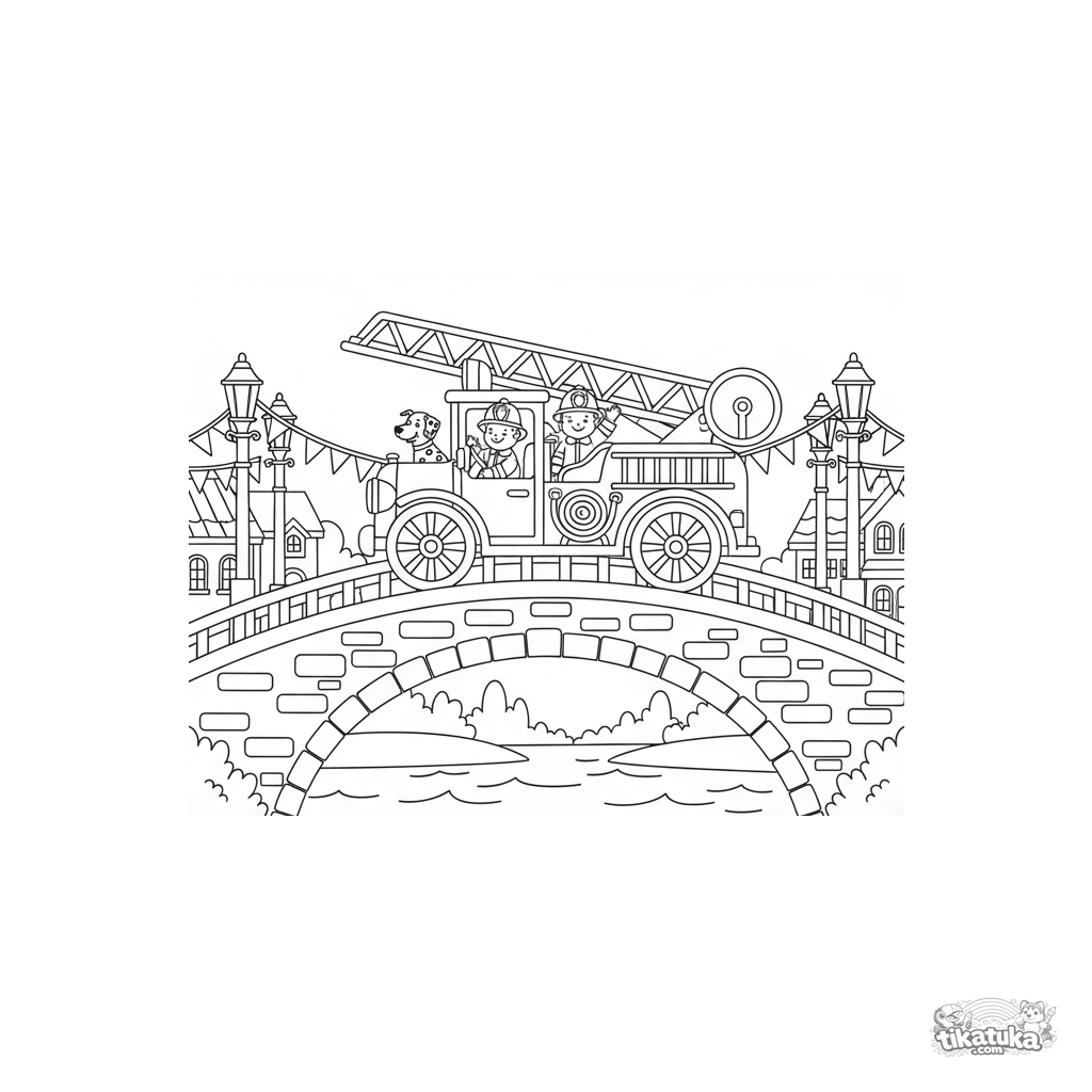 Página para colorear para niños de 7-9 años: un coche de bomberos antiguo participa en un desfile festivo en un puente decorado sobre un río. Estilo libro de cuentos cálido, detalles históricos, ambiente amigable.