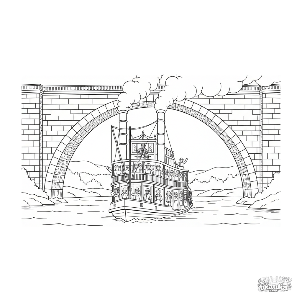 Página para colorear para niños 4-6: un barco de vapor de ruedas pasa bajo el arco de un gran puente de piedra sobre un río. Pasajeros saludan, capitán al timón.