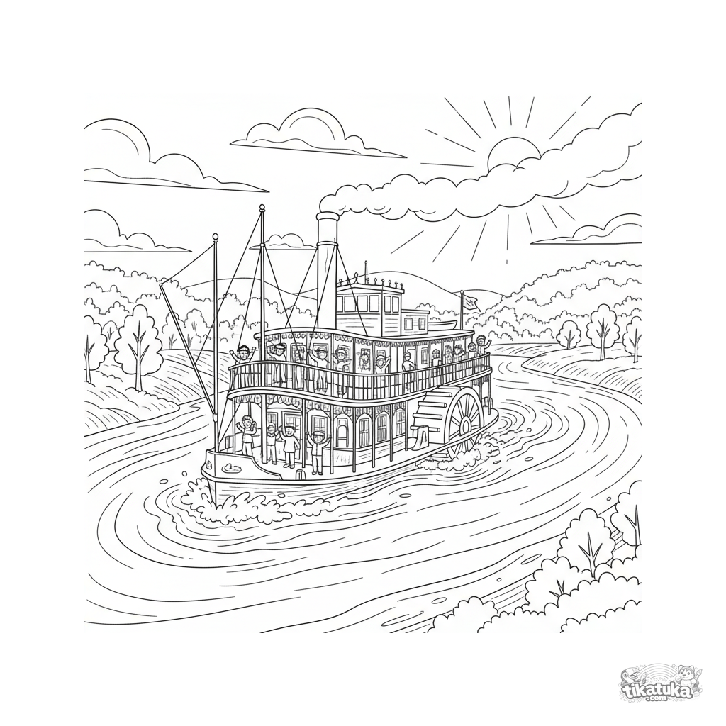 Página para colorear para niños de 4-6 años: un vapor de ruedas clásico navega por un río al atardecer. Pasajeros saludan desde la cubierta, la gran rueda de paletas gira.