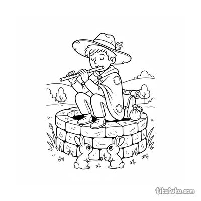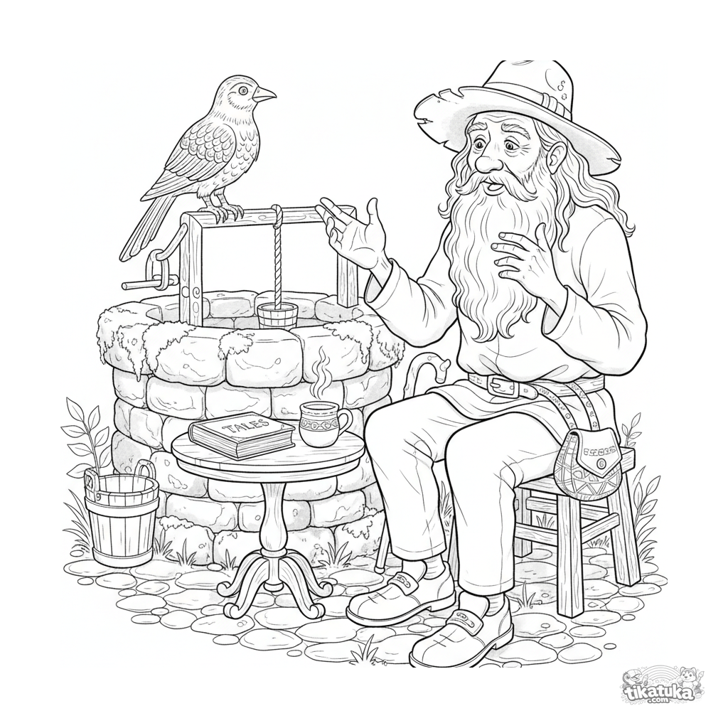 Página para colorear detallada para niños 10-12: un sabio anciano cuentacuentos comparte una historia junto al pozo de agua viva. Escena en estilo acuarela con libro y taza.