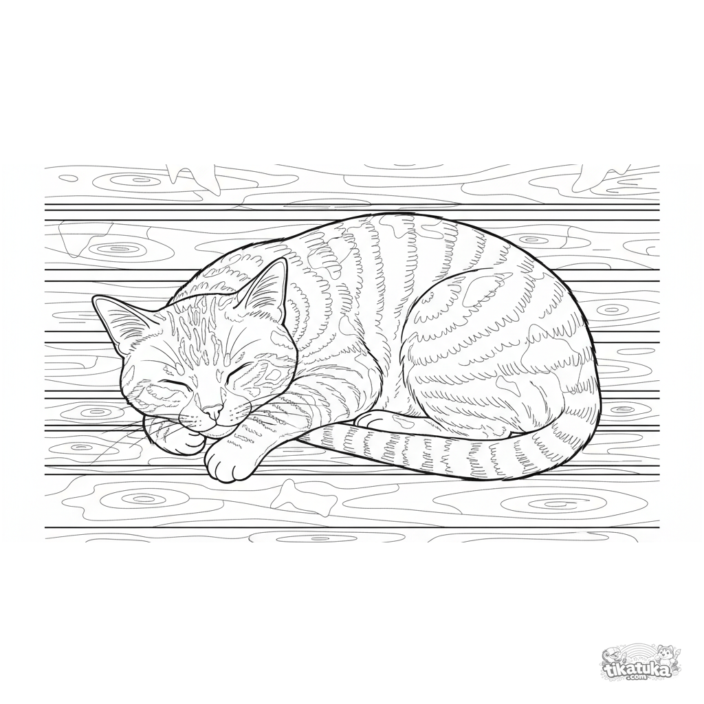 Página para colorear para niños mayores 10-12: un viejo gato atigrado duerme plácidamente en un banco soleado del parque, escena detallada con luz moteada.