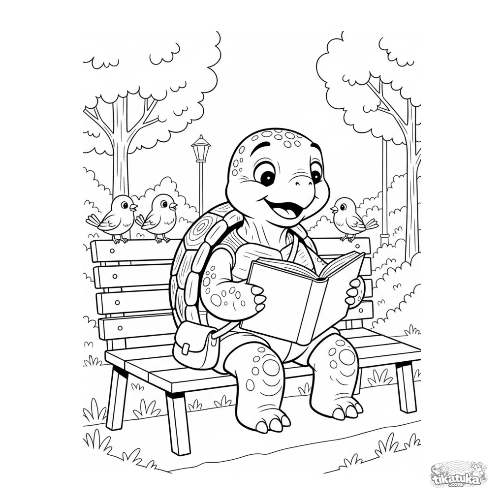 Página para colorear para niños 7-9: una tortuga sabia lee un libro de cuentos en un banco del parque, con pajaritos escuchando.