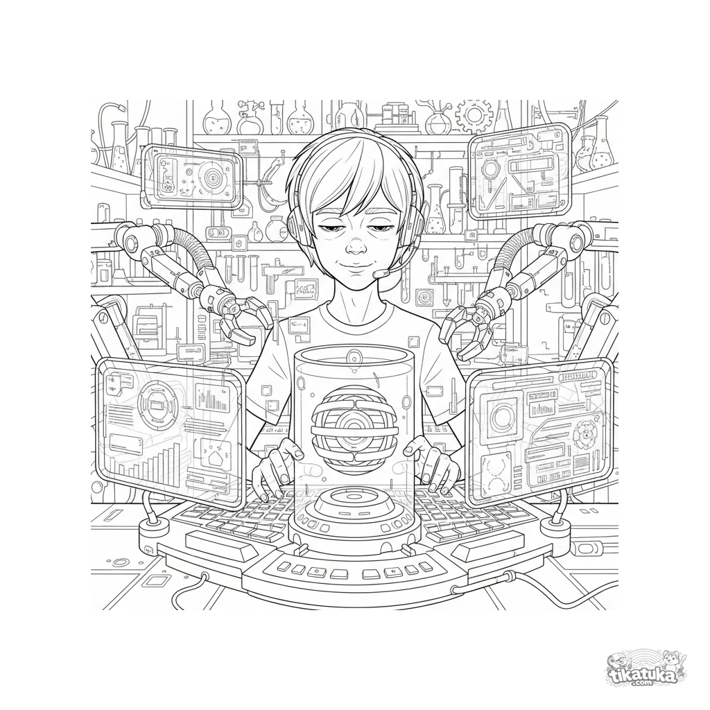 Página para colorear para niños mayores 10-12: un aprendiz de inventor programa un núcleo de IA en una consola holográfica en un laboratorio secreto de alta tecnología.