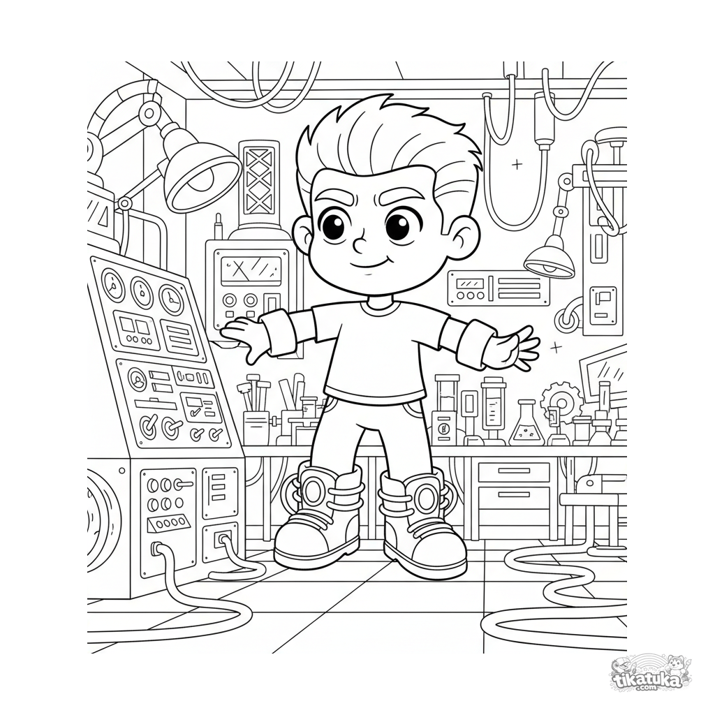 Página detallada para colorear para niños mayores 10-12: un chico prueba botas de levitación magnética experimentales en un laboratorio secreto.