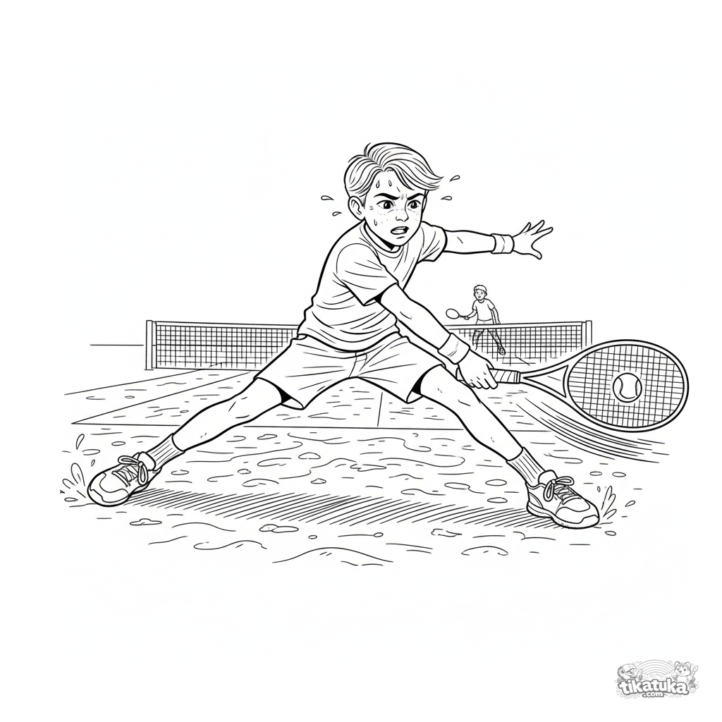 Página para colorear para niños mayores de 10-12 años: escena detallada de un intercambio intenso de tenis en tierra batida. Postura dinámica, equipo detallado y texturas.