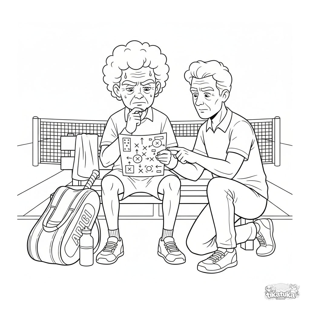 Página para colorear para niños mayores de 10-12 años: escena detallada de un tiempo muerto en tenis. Jugador y entrenador discuten estrategia, emociones, equipo y accesorios detallados.