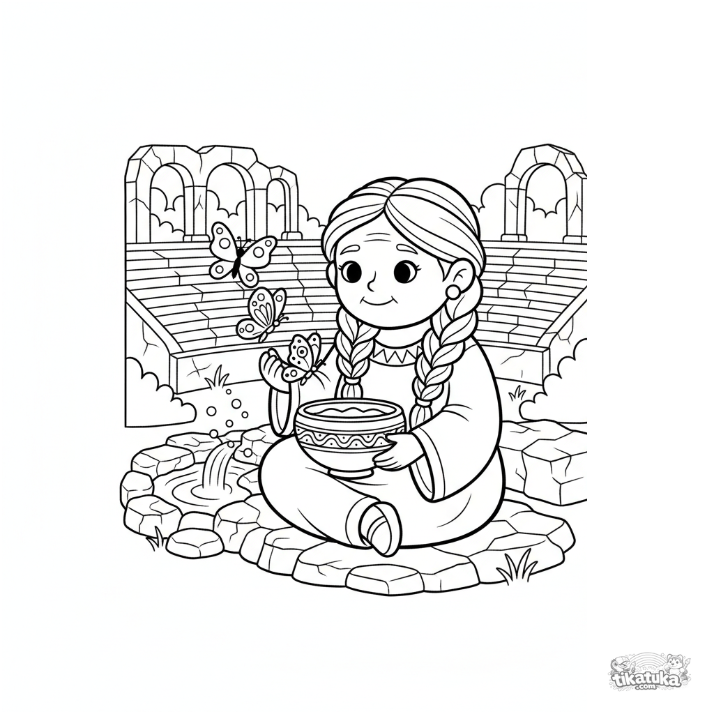 Página para colorear para niños: un oráculo sabio junto a un manantial en un anfiteatro antiguo libera mariposas mágicas. Escena tranquila, adecuada para niños de 6 a 10 años.