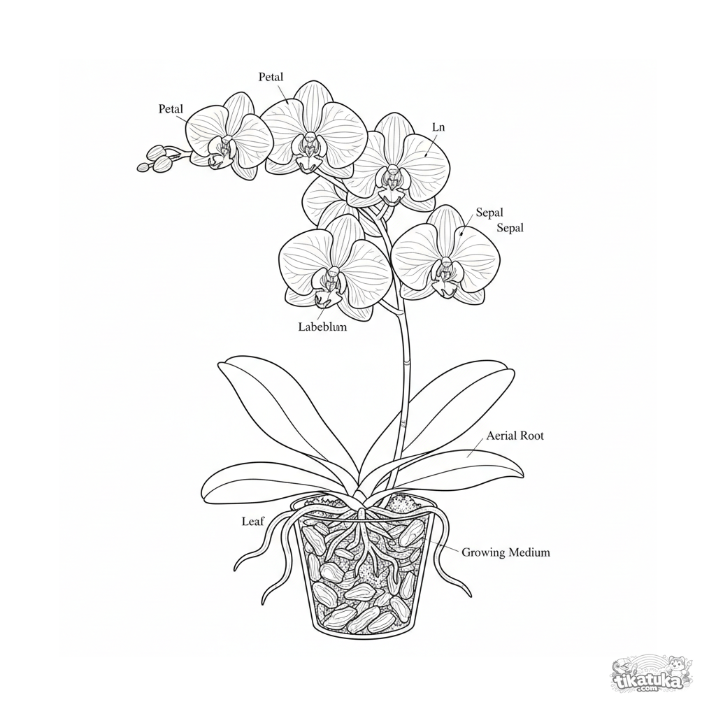 Página botánica intrincada para colorear para niños mayores de 10-12 años. Ilustración detallada de una orquídea en maceta con raíces aéreas. Estilo de grabado vintage.