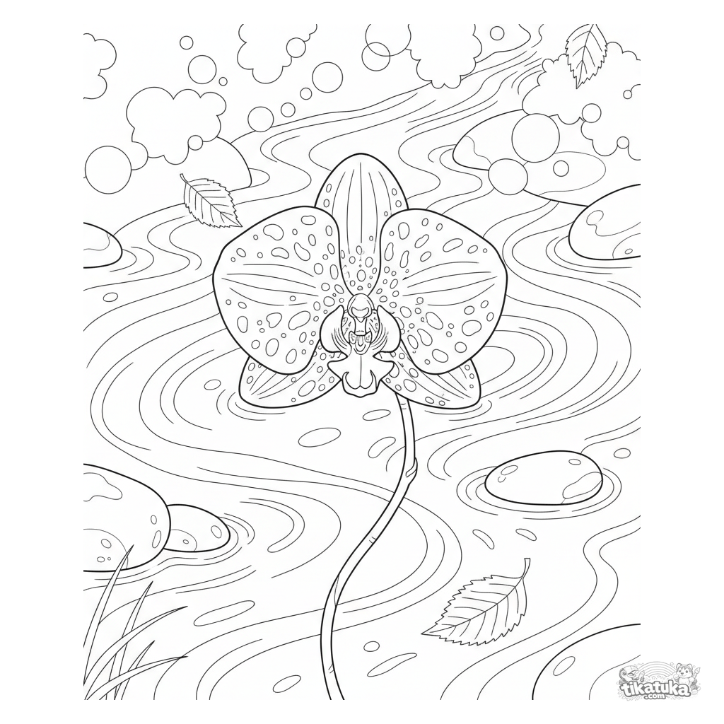 Página para colorear detallada para 10-12 años: una orquídea realista con pétalos moteados flota en un arroyo del bosque. Piedras y hojas intrincadas.