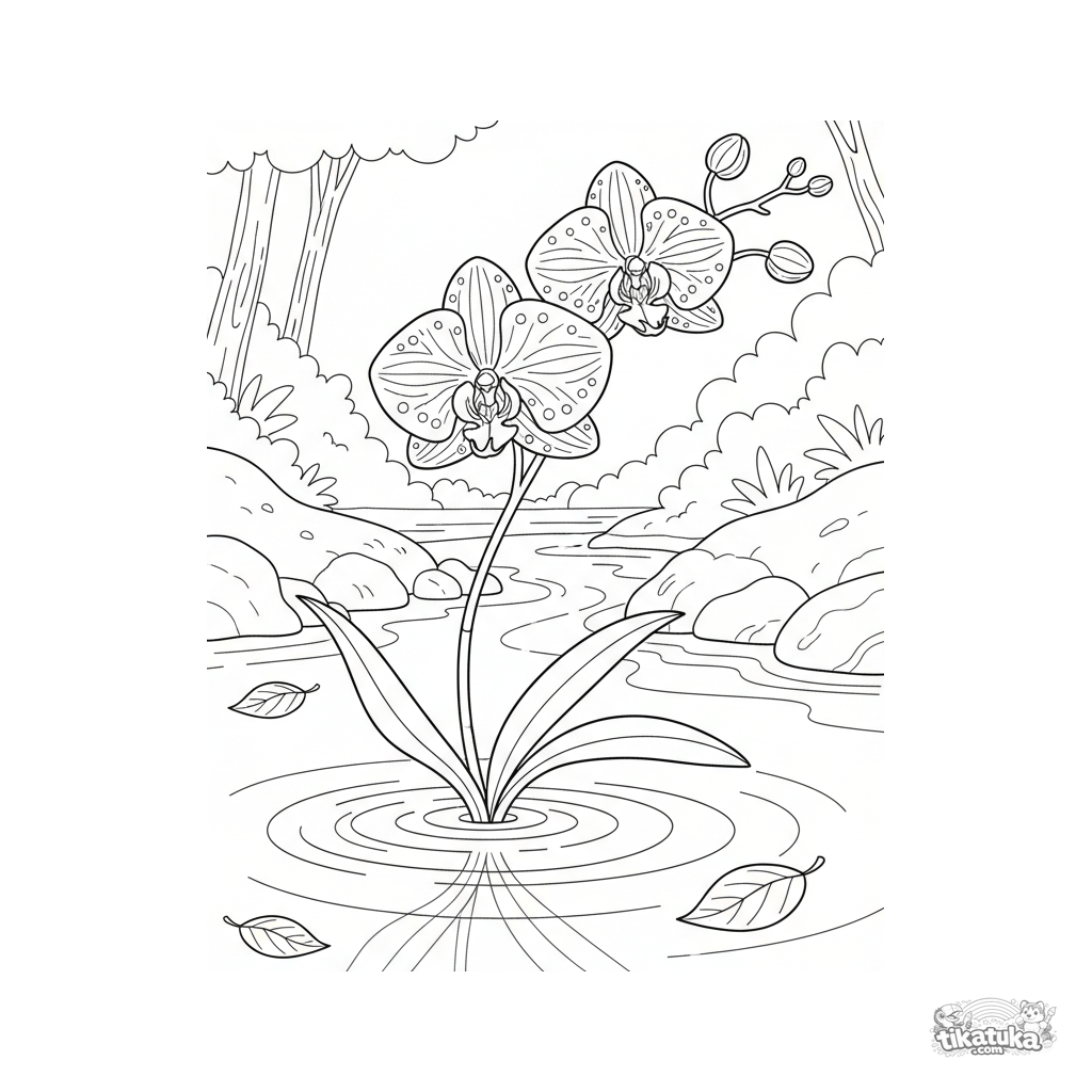 Página para colorear para niños 7-9: una orquídea elegante flotando en un arroyo del bosque con reflejos. Detalle moderado y líneas expresivas.
