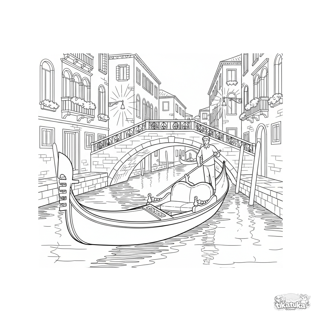 Página para colorear para preadolescentes de 7 a 9 años: una góndola veneciana detallada se desliza bajo un puente de piedra al anochecer. Escena urbana acogedora.