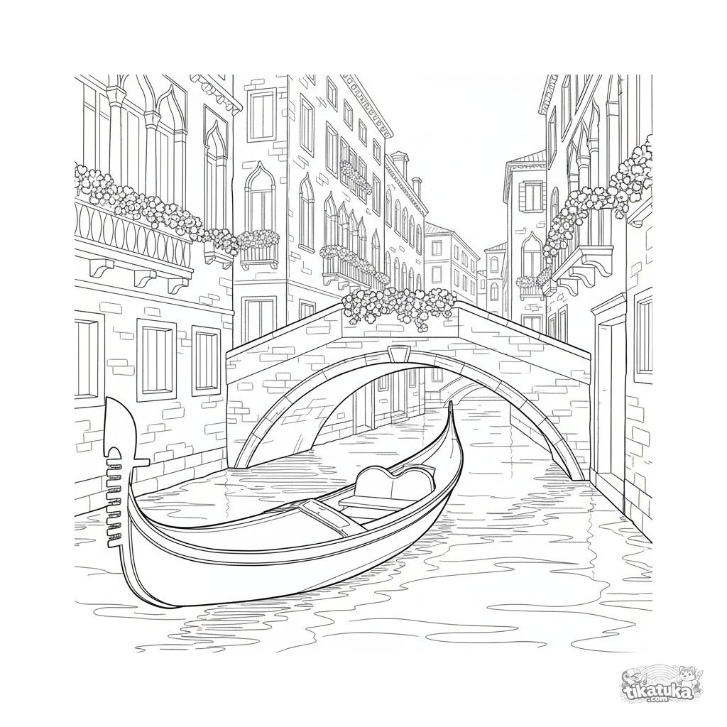 Página para colorear para niños 7-9: una góndola veneciana detallada se desliza bajo un puente de piedra en un canal, con edificios coloridos y macetas de flores al fondo.