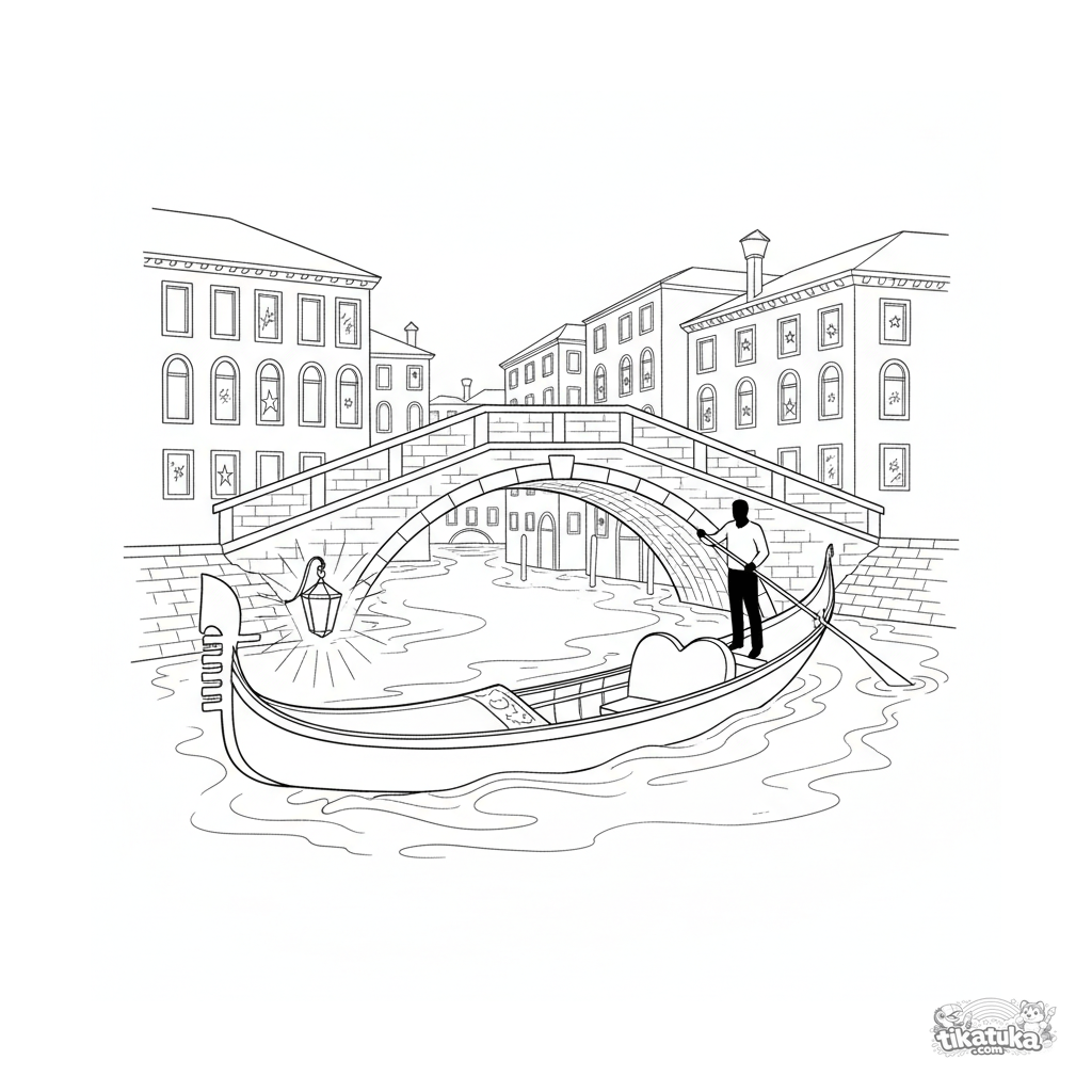 Página para colorear para preadolescentes 7-9: una góndola veneciana detallada con un farol se desliza bajo un puente de piedra al anochecer.