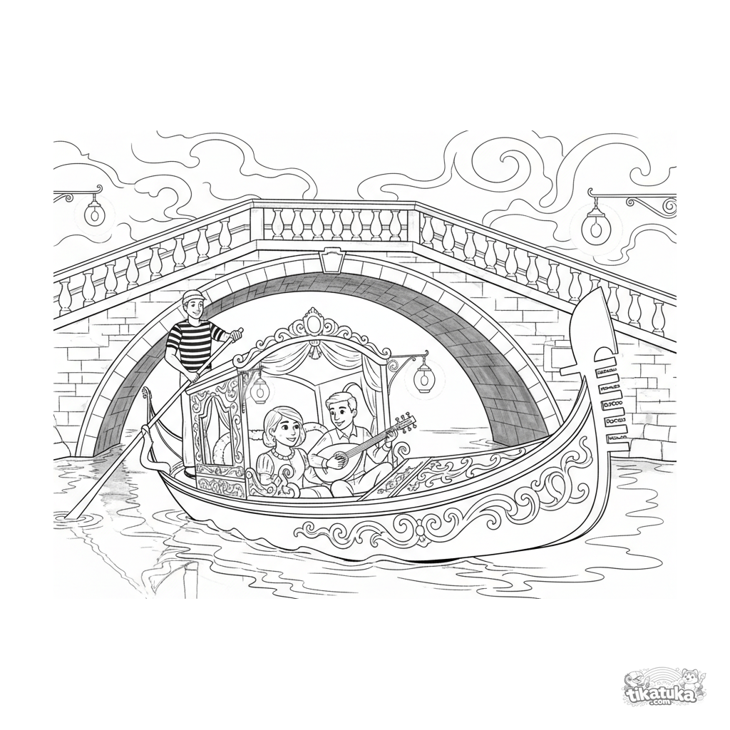 Página para colorear detallada para niños mayores de 10-12 años: una góndola veneciana ornamentada con un músico se desliza bajo un puente al anochecer.
