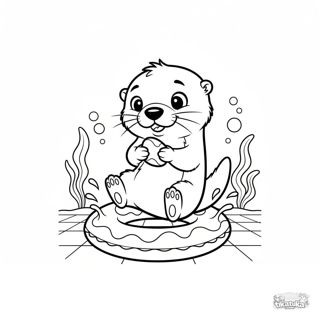 Página para colorear para niños de 7-9 años: un lindo cachorro de nutria intenta mantener el equilibrio sobre un aro inflable en el fondo de la piscina.