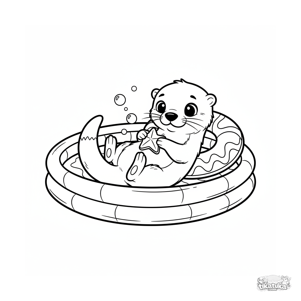 Página para colorear para niños de 4-6 años: un alegre cachorro de nutria se acuesta de espaldas en el fondo de la piscina, equilibrando un juguete en su vientre. Formas redondeadas suaves, escena linda.