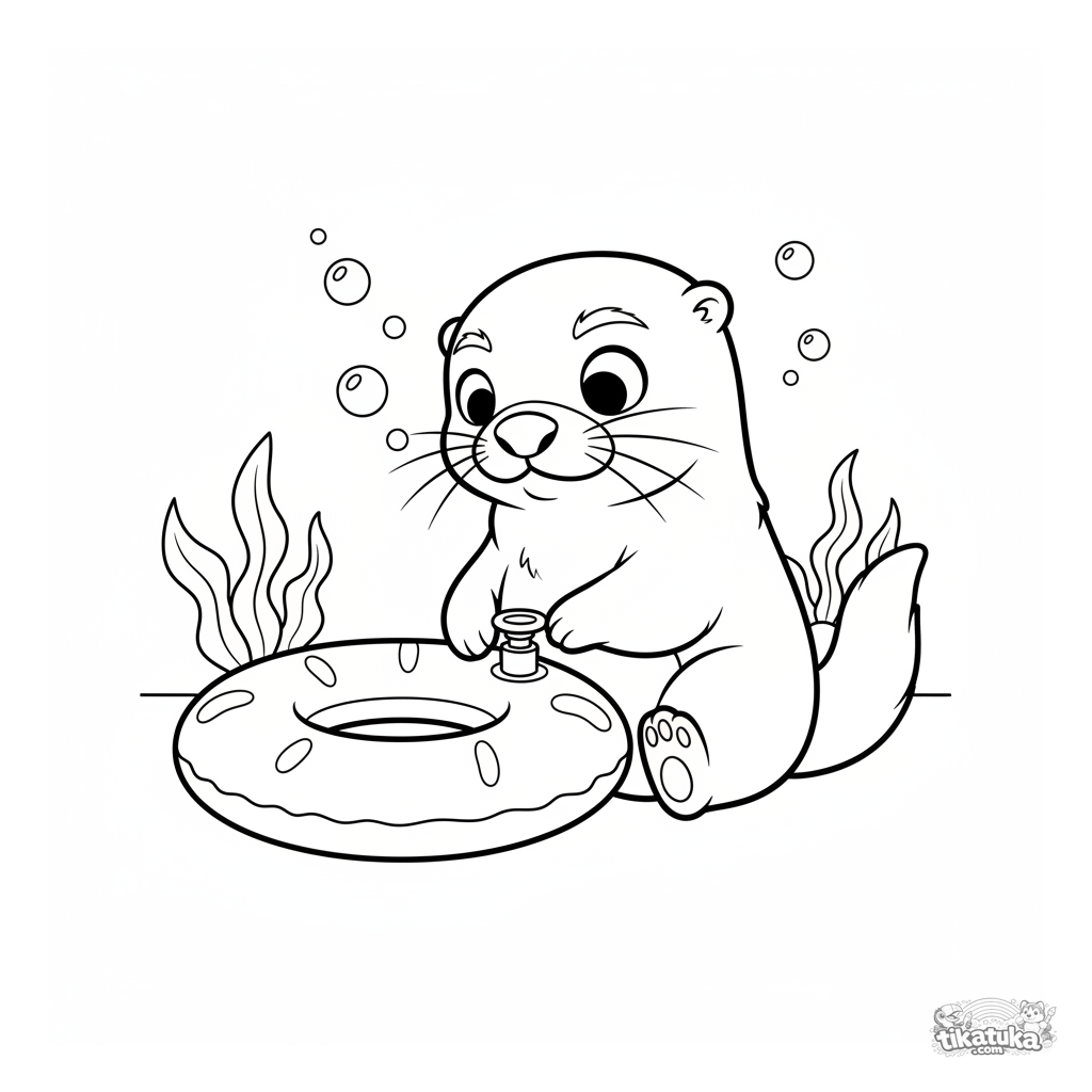 Página para colorear para niños 4-6: un travieso cachorro de nutria se sienta en el fondo de la piscina, investigando con curiosidad la válvula de un aro inflable.