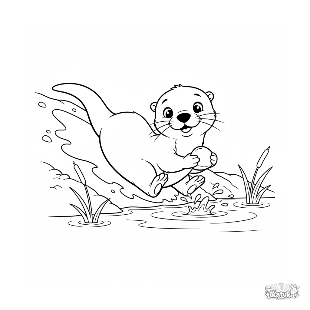 Página para colorear para niños 4-6: un cachorro de nutria se desliza por una orilla fangosa hacia un arroyo claro, sosteniendo una piedra.