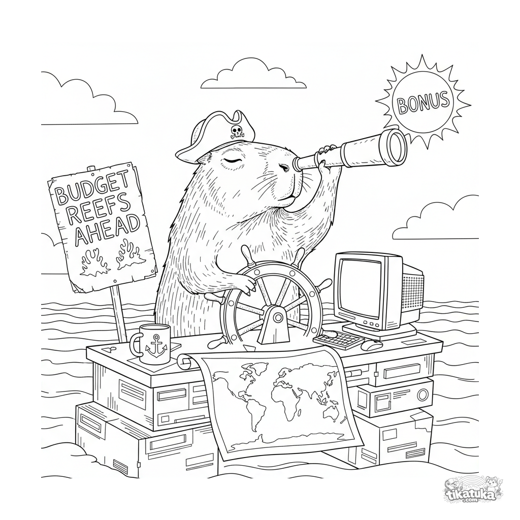 Página para colorear compleja para niños de 10-12 años: una capibara muy segura con sombrero de pirata busca una bonificación con un catalejo en el timón de un escritorio-barco. Meme detallado.