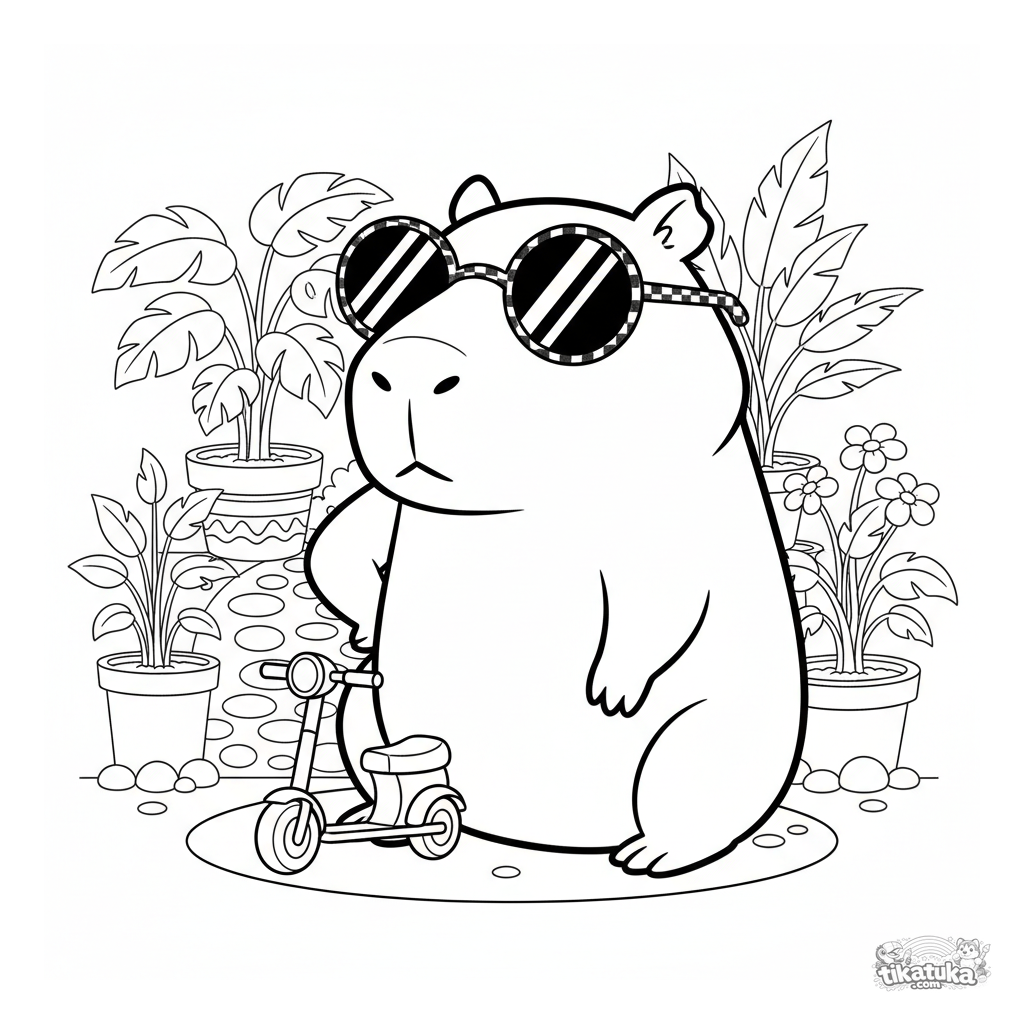 Página para colorear para niños 7-12: un carpincho enorme y demasiado seguro con gafas de sol posa con orgullo junto a un scooter minúsculo. Escena absurda y divertida al estilo de memes de internet.
