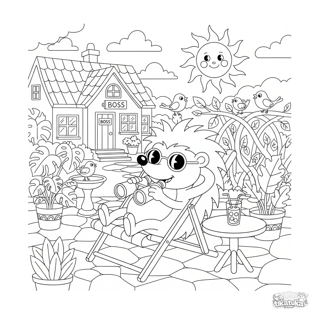 Página para colorear graciosa en estilo retro: un erizo presumido con gafas de sol se relaja en una tumbona con prismáticos, buscando el día de pago. Escena detallada de patio.