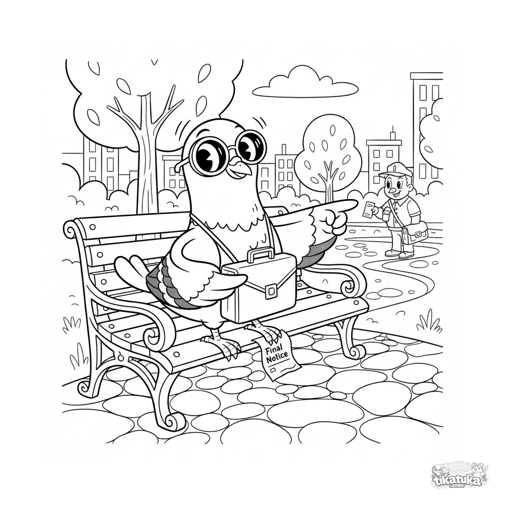 Página para colorear para niños 10-12: una paloma confiada con gafas de sol usa prismáticos para rastrear al cartero con el cheque desde un banco del parque.