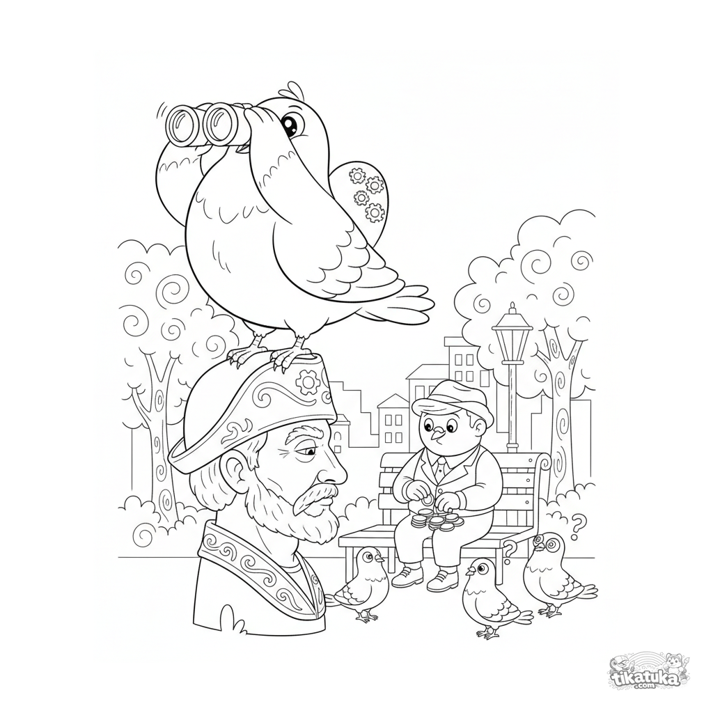 Página para colorear para niños: una paloma regordeta y confiada con prismáticos en la cabeza de una estatua del parque, mirando por encima del hombro a una persona que cuenta monedas. Escena caótica y graciosa en estilo retro.