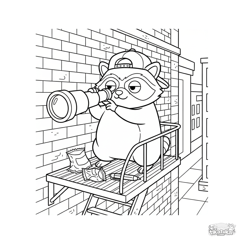 Página para colorear para niños mayores: un mapache confiado con gorra espía su salario con un telescopio en una escalera de incendios. Meme detallado con pared de ladrillo.