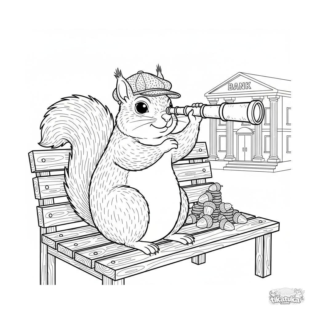 Página para colorear para niños 10-12: una ardilla confiada en un banco del parque con telescopio, buscando su salario en el banco. Escena realista y detallada.