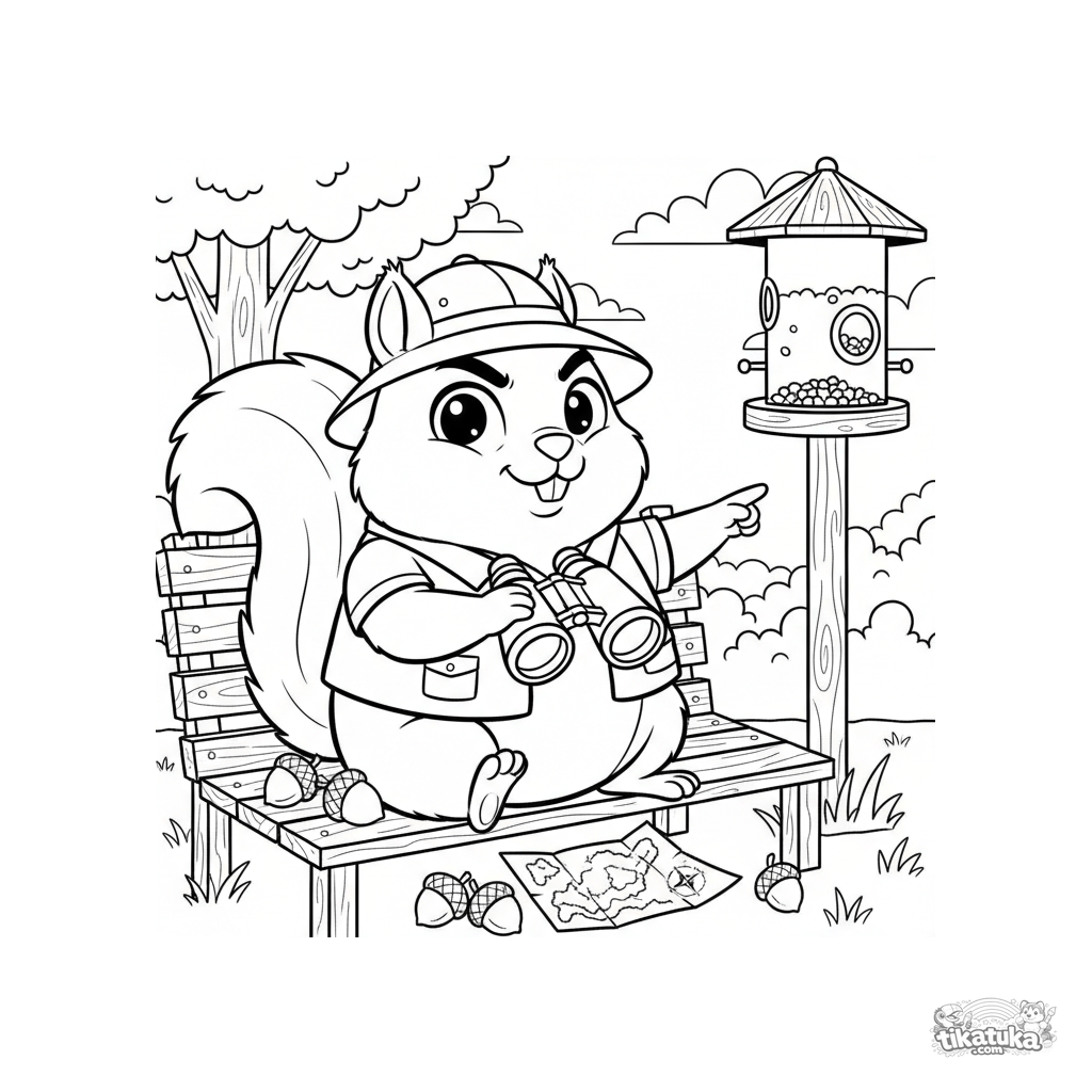 Página para colorear para niños mayores: una ardilla confiada en un chaleco safari en un banco del parque mira con prismáticos. Escena de meme divertida con elementos detallados del parque.