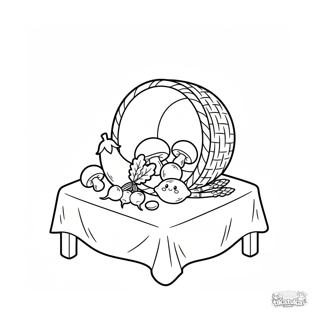 Página para colorear simple para niños pequeños 2-3: una cesta llena de verduras y frutas en el mercado. Formas grandes reconocibles, contornos gruesos, estilo de estampa popular.