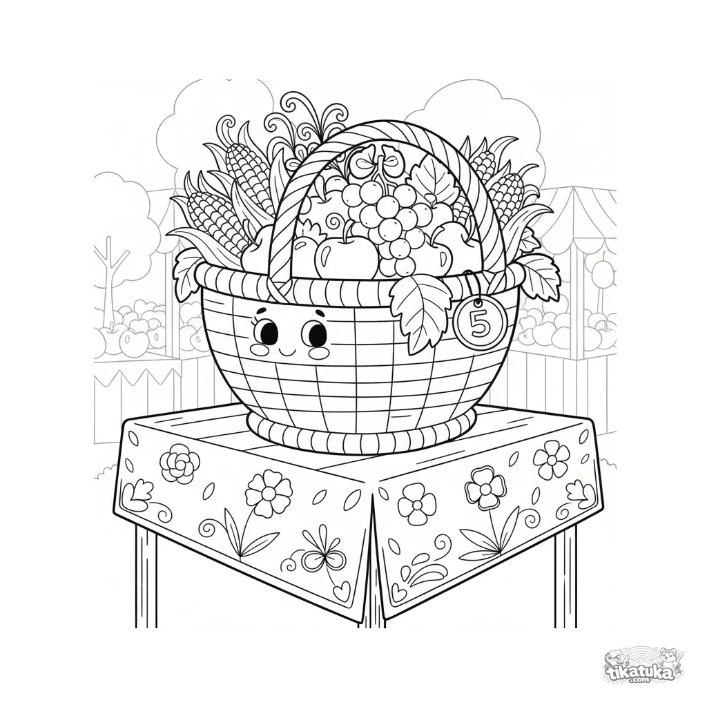 Página para colorear de cesta cornucopia desbordante en puesto de mercado. Para niños 4-6. Estilo folk lubok brillante.