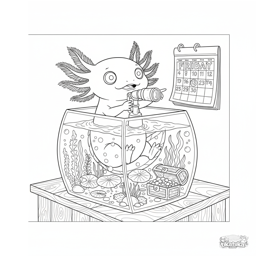 Página para colorear para niños 10-12: un ajolote en una pecera de escritorio, mirando por un periscopio hacia un calendario con sorpresa. Escena realista divertida y detallada.