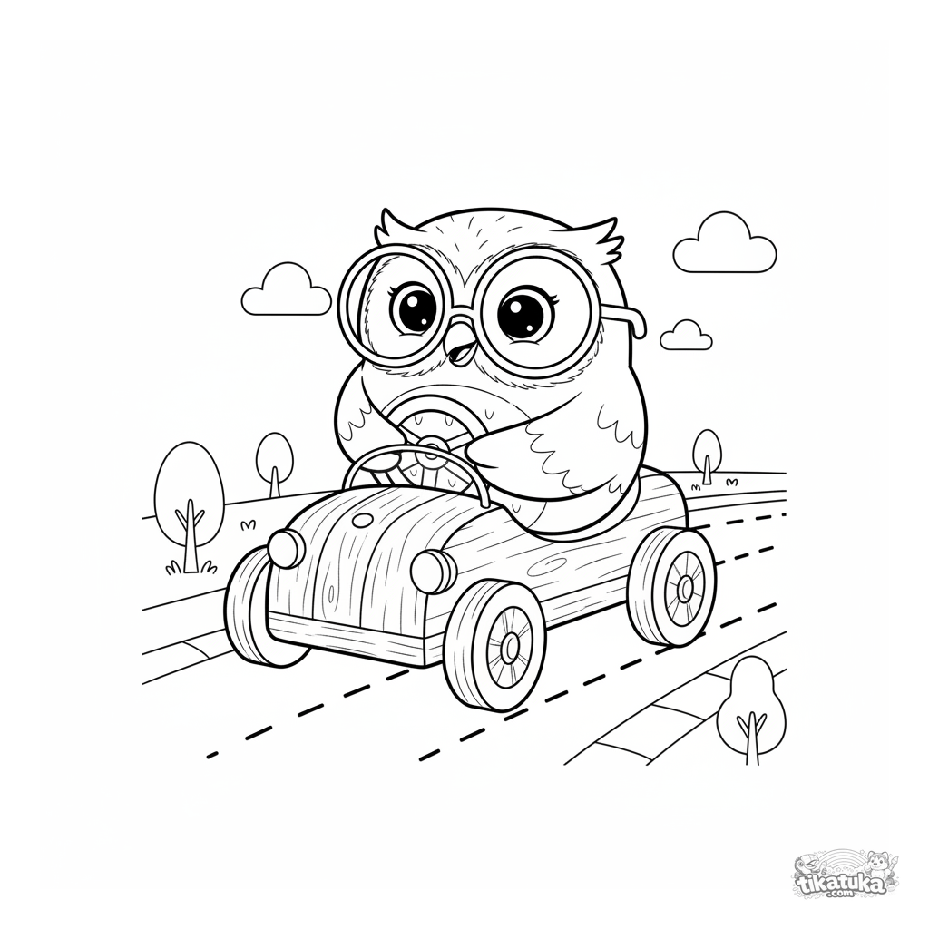 Página para colorear para niños de 4-6 años: el búho Oof conduce un coche de juguete de madera. Formas geométricas, estilo de juguete de madera escandinavo.