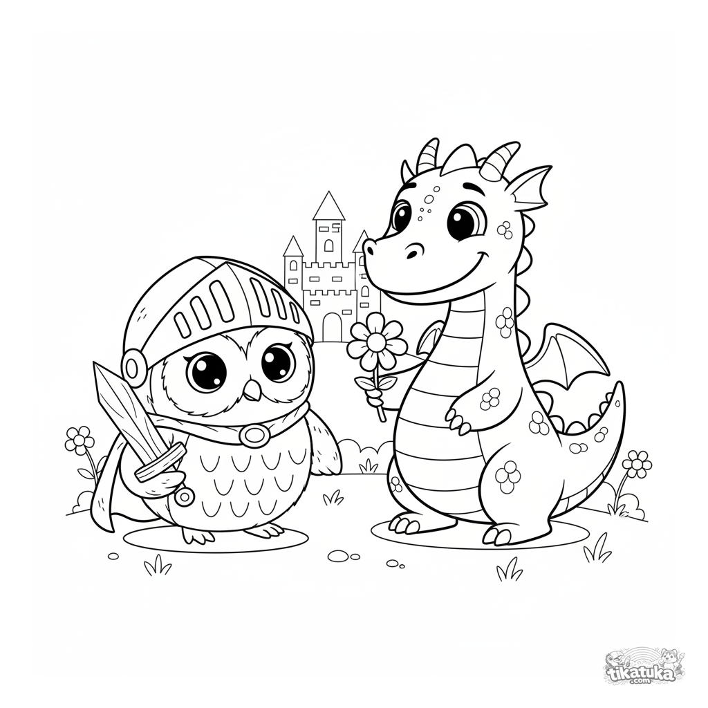 Página para colorear para niños 4-6: el búho Oof en armadura de caballero conoce a un dragón amable que sostiene una flor. Escena pacífica, formas simples.
