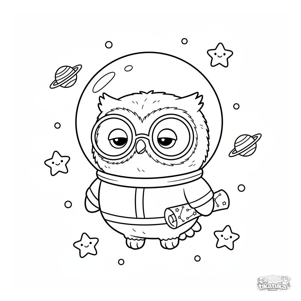 Página para colorear para niños 4-6: el lindo búho Oof en traje espacial flota entre planetas. Líneas simples, amplios márgenes.