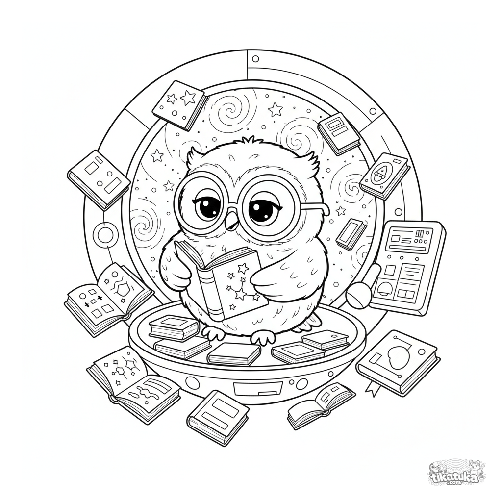 Página para colorear para niños de 4-6 años: el lindo búho bibliotecario Oof flota en una biblioteca espacial. Líneas simples, estilo de peluche escandinavo.