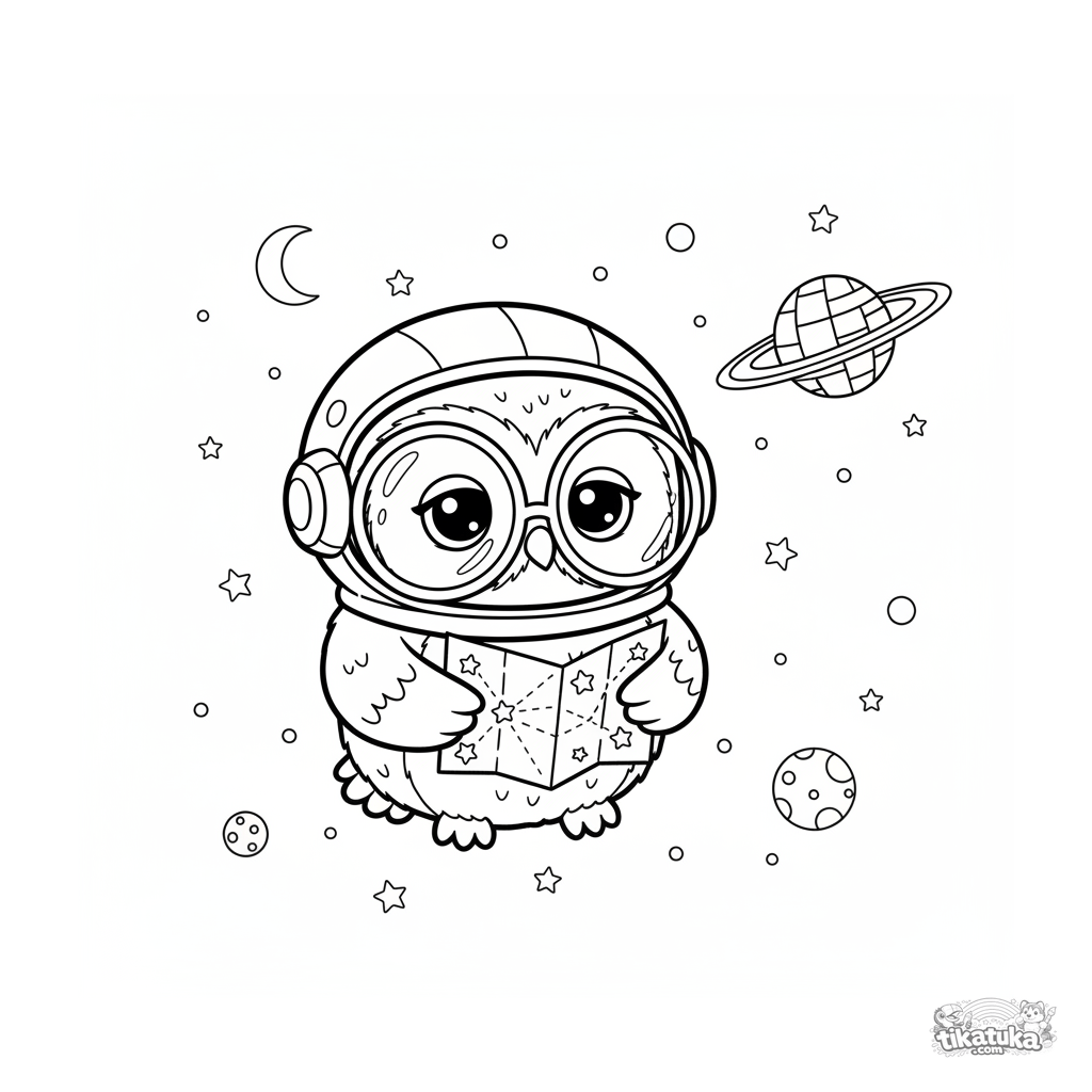 Página para colorear para niños 4-6: el lindo buhíto bibliotecario Owl Oof como astronauta flotando en el espacio exterior con un mapa estelar. Líneas simples, estilo de peluche escandinavo.