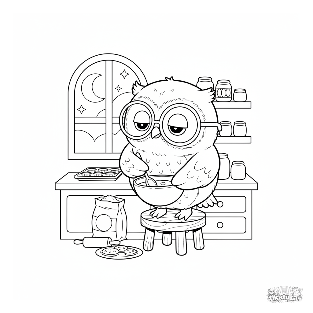 Página para colorear para niños 4-6: el lindo búho bibliotecario Oof horneando cupcakes en una minicocina acogedora. Líneas simples, estilo de peluche escandinavo.