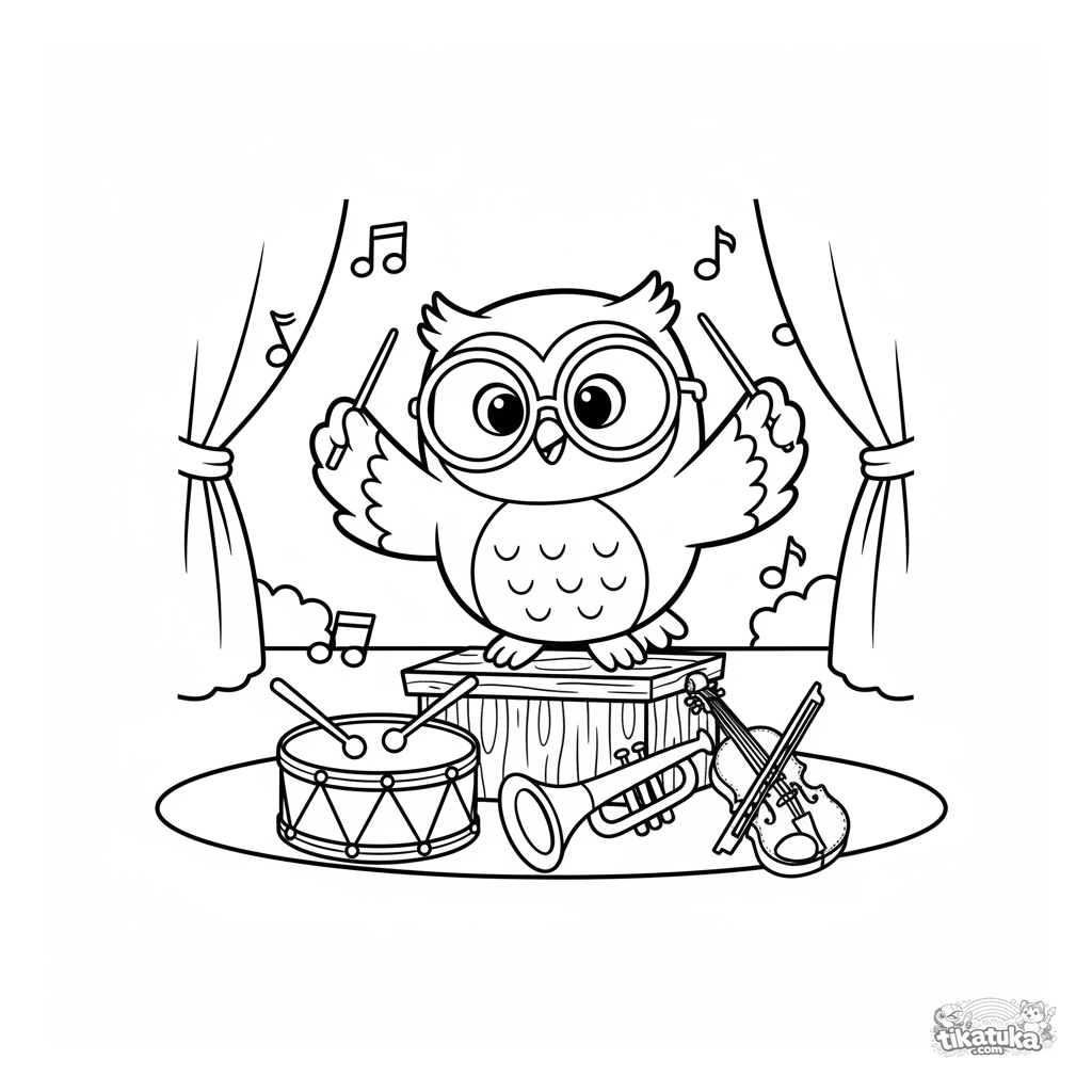 Página para colorear para niños de 4-6 años: el búho Oof dirige una alegre orquesta de instrumentos de juguete. Estilo de marioneta suave, notas musicales flotantes.