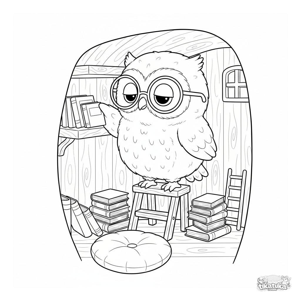 Página para colorear con un lindo búho bebé bibliotecario en una acogedora casa del árbol. Para niños de 4 a 6 años.