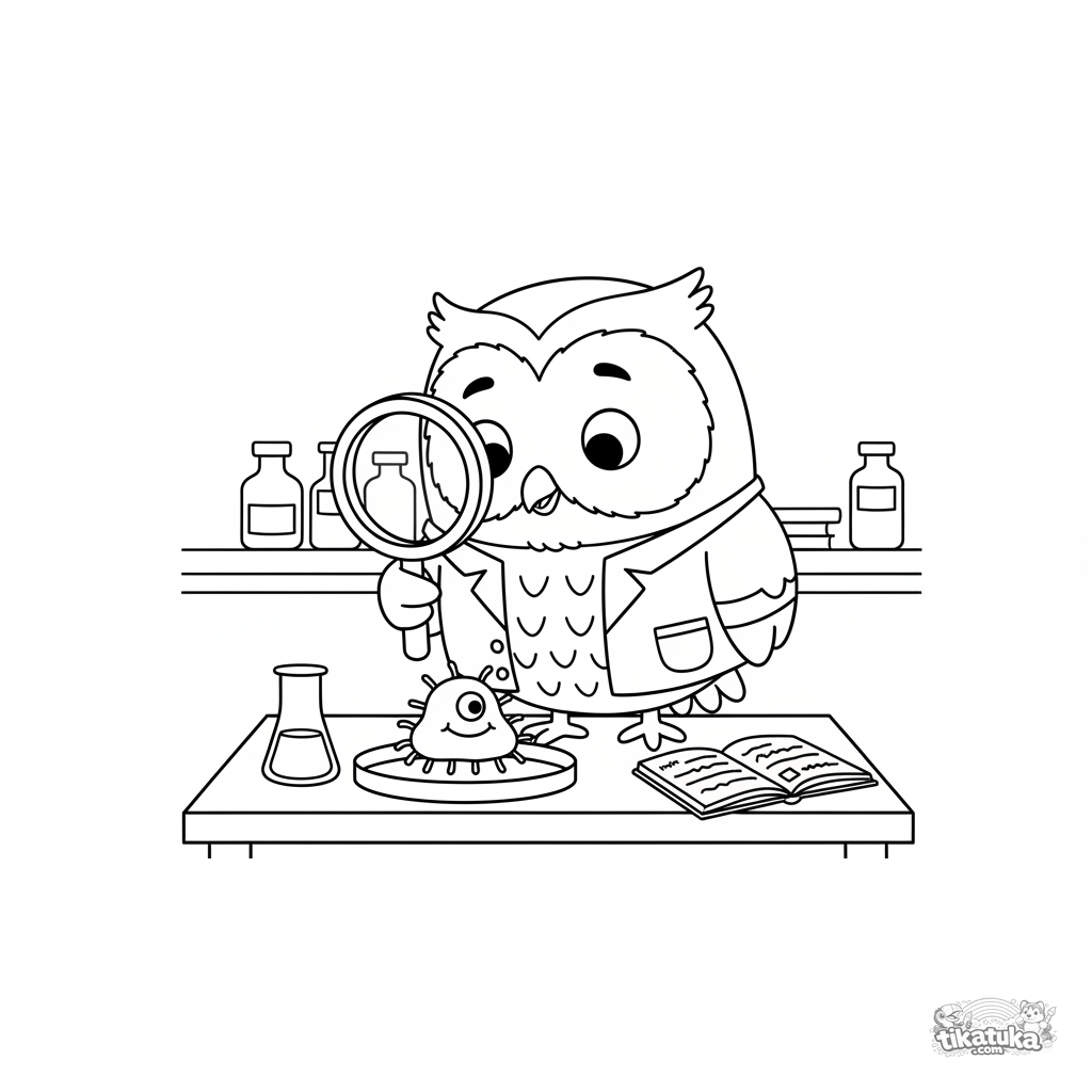 Página para colorear para niños 4-6: el búho Oof en un laboratorio estudia un microbio amigable en una placa de Petri. Formas suaves, detalles claros.