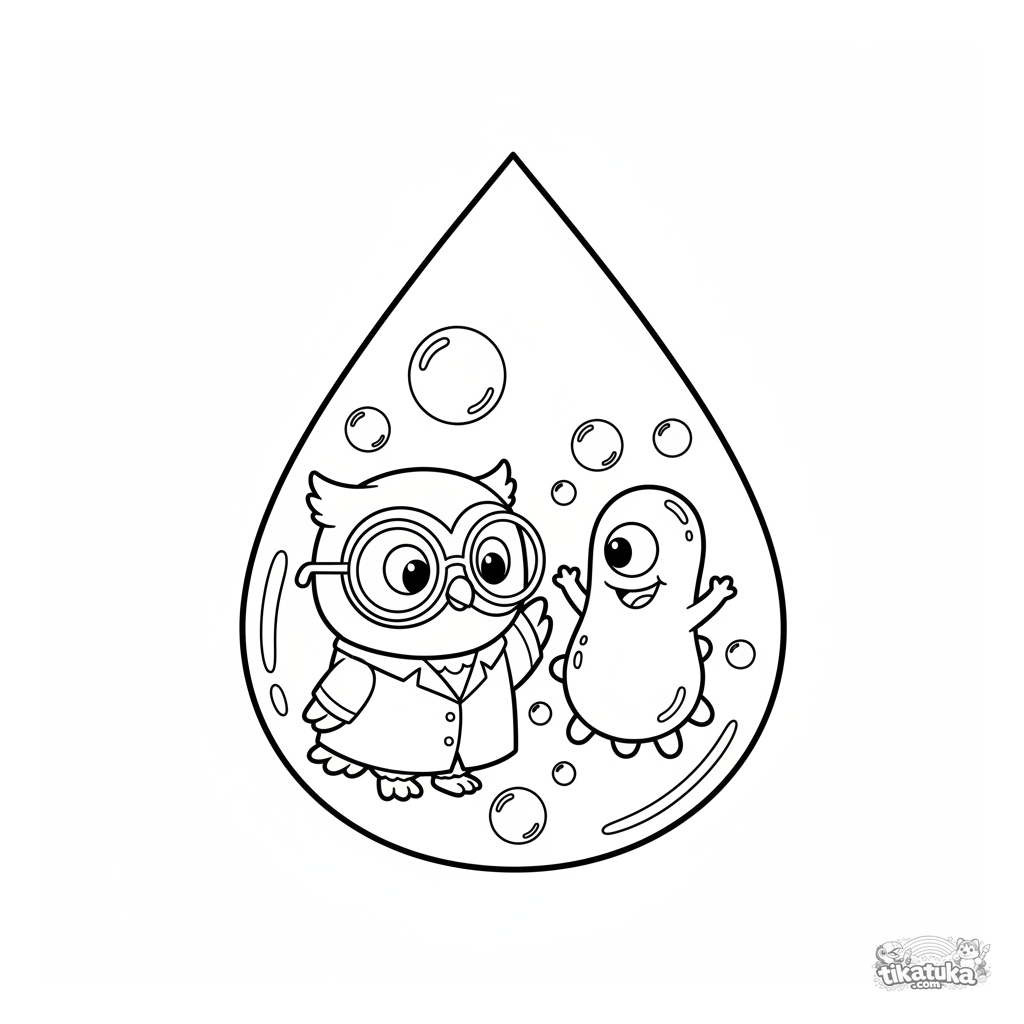 Página para colorear con Búho Oof en bata de laboratorio observando un germen amigable dentro de una gota de agua. Para niños de 4 a 6 años.