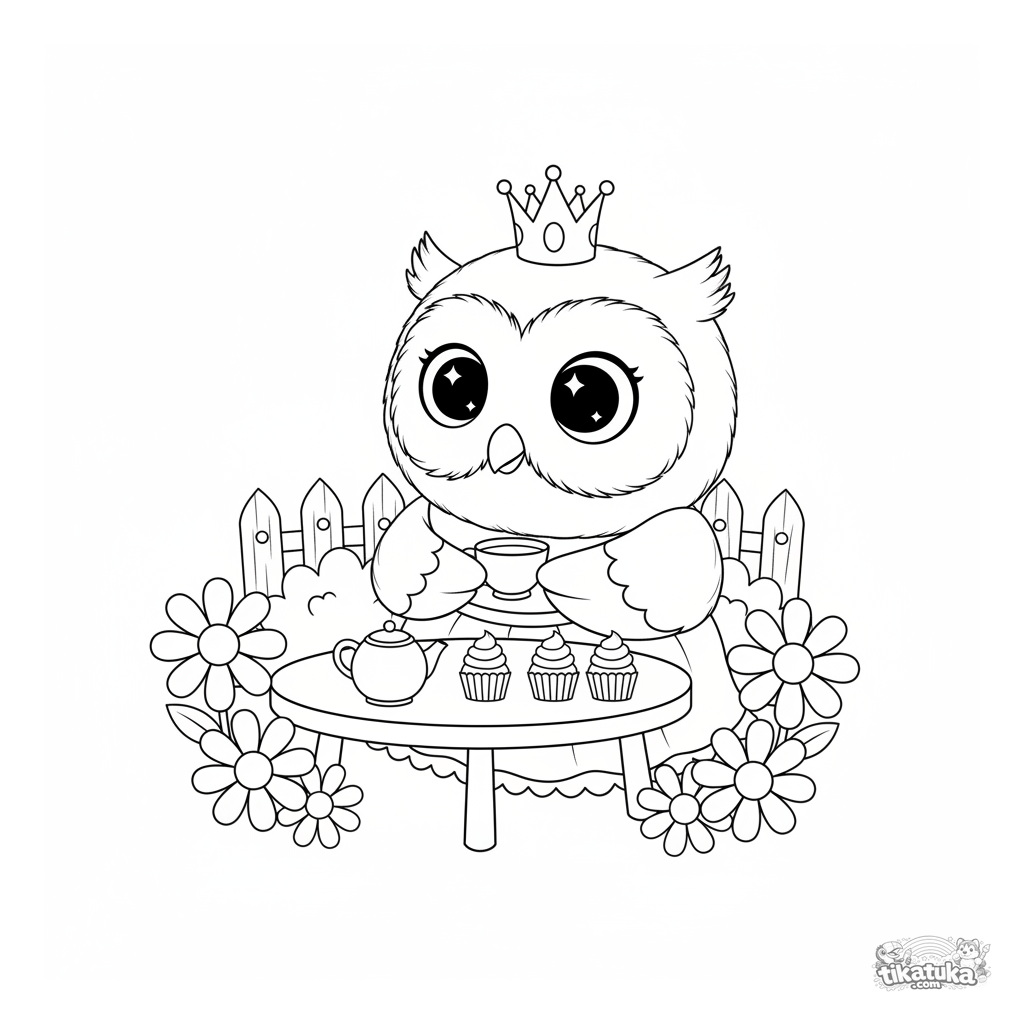 Página para colorear con Búho Oof como princesa en una elegante fiesta de té en el jardín. Para niñas de 4 a 6 años.